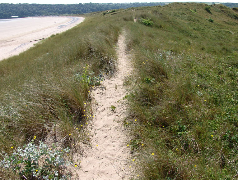 One of the most obvious ways in which humans influence sand dune systems is by trampling. In front of a sand dune system is always a beach, and of course humans often want to be on that beach. Behind sand dune systems car parks are often situated so one of the commonest ways in which sand dune systems get trampled is a from car park to beach. Many paths therefore run at right angles to the dune ridges.